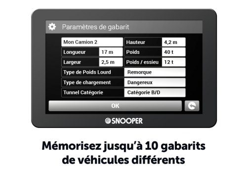 Equipé d'un grand écran HD Fluide de 5 pouces (13 cm), le GPS Poids-Lourds Snooper PL5400 calcule votre itinéraire en fonction des dimensions, du poids et des matières transportées du poids-lourd. Pour cela, il suffit de renseigner la hauteur, la longueur, la largeur et le poids du camion afin que le GPS vous guide par la route adaptée (exclusion des ponts bas, routes trop étroites, routes limitées en tonnage...).