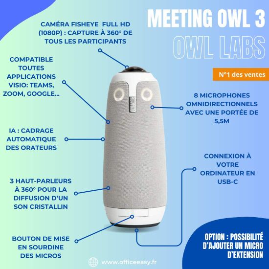 La solution de visioconférence de OwlLabs est l'outil idéal pour vous offrir une expérience de réunion exceptionnelle. Avec une caméra à 360°, votre image est en très haute résolution (1080p) tout en vous offrant un son premium grâce aux 8 microphones. Cette solution est idéale pour les salles de réunion de taille moyenne.