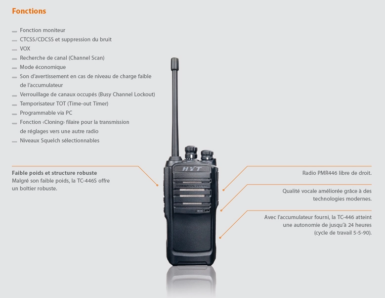 Le HYT TC446S est un émetteur-récepteur PMR446 (Fréquences Libres) professionnel et polyvalent, léger et résistant, doté d'une autonomie élevée et d'une qualité de transmission vocale répondant aux plus exigeants.