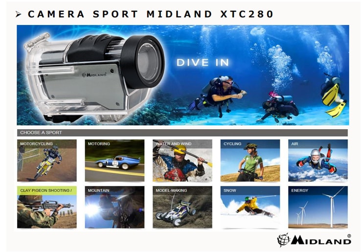 Ultra légère et compacte, la caméra Midland XTC 280 s'emporte et se fixe partout : sur votre guidon de vélo, de moto ou de votre casque... Elle capture toutes les images en mer grâce à sa coque étanche ou en montagne…La coque étanche fournie protège complètement la caméra de l’eau jusqu’à une profondeur de 60 mètres, et de toutes autres substances qui pourraient l’endommager.