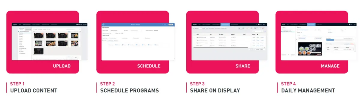 Vanuit de iiSignage-interface kunt u eenvoudig uw communicatie creëren, deze op uw schermen starten en in realtime volgen wat er wordt weergegeven .