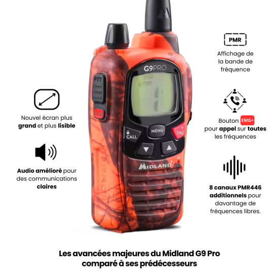Deze versie Blaze behoudt alle kenmerken van de klassieke Midland G9 Pro , waardoor volledige compatibiliteit met uw andere Midland G9-radio's wordt gegarandeerd dankzij een identieke volgorde van kanaalfrequenties.