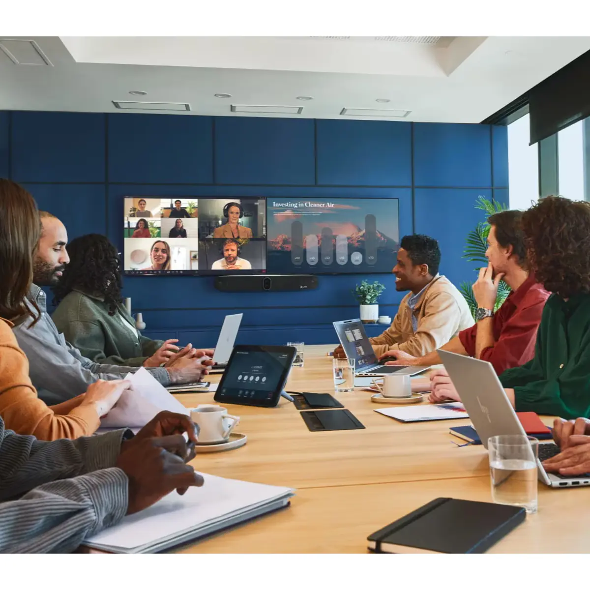 De audiokwaliteit is er ook. De microfoons hebben een bereik van 7,6 meter om grote ruimtes te bedekken. Ze bevatten Poly Noise BlockAI, een technologie gebaseerd op AI en machinaal leren, om omgevingsgeluid te blokkeren dat samenwerking op afstand kan verstoren. Wat de audio-uitzending betreft, deze wordt verzorgd door twee stereoluidsprekers die de kamer vullen met kristalhelder geluid.