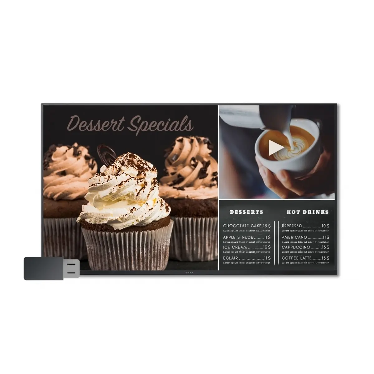 Ontdek de gratis software digital signage van het merk Sony . Met deze software, direct geïntegreerd op het scherm, kunt u inhoud voor uw klanten creëren : menu voor uw restaurant, promoties om in uw winkel weer te geven, informatie om te delen met uw patiënten in de wachtkamer, enz.