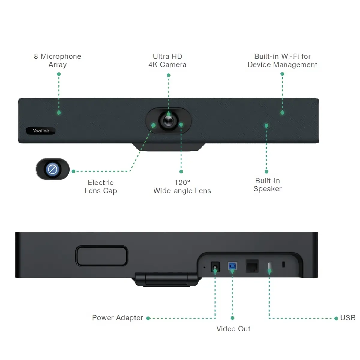 De video conference soundbar Yealink UVC34 bevat een UHD 4K slimme camera , 8 microfoons en een krachtige luidspreker . Ideaal voor persoonlijk gebruik, een huddle room of een kleine vergaderzaal-vergadering, hij kan eenvoudig worden aangesloten op USB op een PC of een Mac.