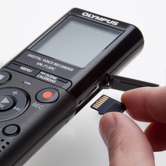L’enregistreur Olympus VN-713PC dispose d'une mémoire interne de 4 Go (1626h d'enregistrement en mode LP) et intègre un lecteur de carte micro SD pour des enregistrement illimités.