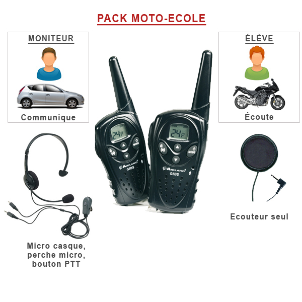 Conçu pour les moto-écoles, ce pack spécial est idéal pour des cours donnés par un moniteur en voiture à l'élève en moto.