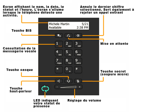 Le Polycom CX300 est équipé d'un écran rétro-éclairé, d'un pavé de numérotation et propose une qualité audio large bande en haute définition. Il est également doté d'un haut parleur Full Duplex ainsi que d'une prise casque pour vous permette de passer des appels les mains libres. Des témoins lumineux vous indiquent l'état de transfert des appels, les messages en attente ainsi que votre état de présence.