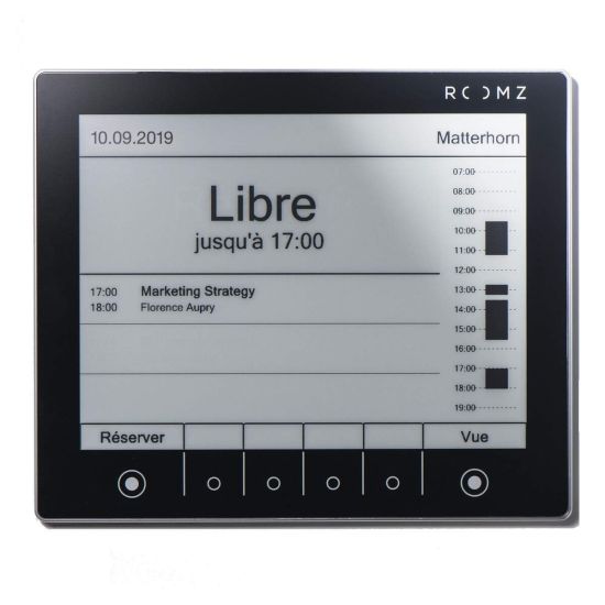 Le Roomz Display informe en un clin d'œil sur la disponibilité de la salle. Certaines informations, tels que le nom de l'organisateur et l'objet de la réunion, peuvent être affichées ou masquées. Un affichage multi-vue vous permet de jongler entre une vue journalière et hebdomadaire.