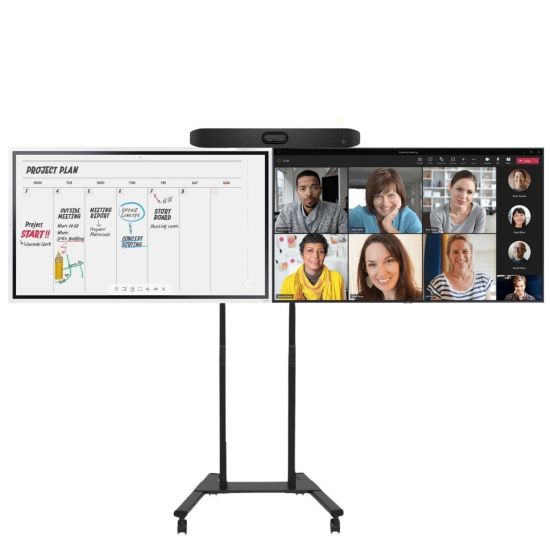 Kit de visioconférence avec 1 écran interactif, 1 écran passif, une barre de visioconférence Poly Studio V12 et un pied roulant double écran motorisé.